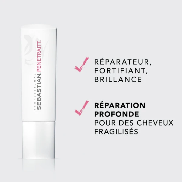 - Shampooing Penetraitt Sebastian 50 ml. Lavez et fortifiez les cheveux abîmés avec le shampooing Penetraitt de Sebastian Professional. Le système réparateur de ce produit capillaire professionnel pénètre en profondeur dans le cheveu, éliminant ainsi les impuretés tout en fortifiant les cheveux. Le shampooing réparateur de Sebastian fortifie les cheveux fragilisés par les traitements chimiques, la chaleur et les éléments environnementaux. Pour des cheveux propres, doux et volumineux. Recommandé pour apporter de la brillance et de l’intensité aux cheveux colorés.