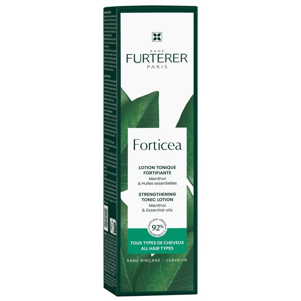 Lotion énergisante Forticea René Furterer, formulée à 92% d’ingrédients d’origine naturelle, pour donner force et énergie aux cheveux.