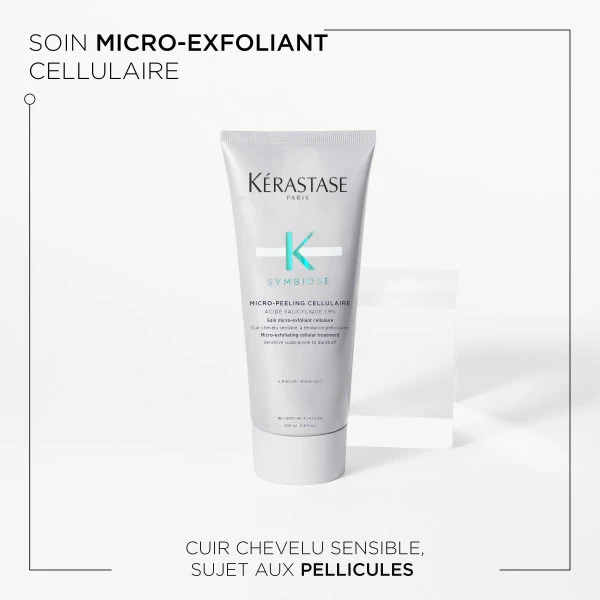 Le Micro-Peeling Cellulaire Symbiose est destiné aux cuirs chevelus sensibles, à tendance pelliculaire. Sa formule purifiante aux billes végétales et à l’acide salicylique permet une double exfoliation instantanée, en ciblant les cellules mortes et en éliminant les pellicules au niveau biologique et visuel. Le cuir chevelu est purifié sans être agressé. Ces résultats sont possibles grâce à sa formulation unique, enrichie de la plus haute concentration en acide Salicylique. Cet actif puissant élimine les pellicules présentes sur votre cuir chevelu, associé à l’action de peeling des billes d’argan et d’abricot.
